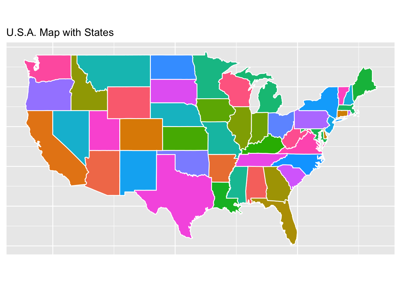 - In order to get more information about USA, now we can add state data to the map. Like above, we obtain data from maps and mapdata packages, and use